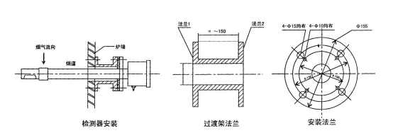 4、炉墙上的氧化锆探头固定法兰安装时,用钢材做成如图形状的过渡架,过渡架的法兰能直接焊在炉墙处壁上或埋入炉墙中,但要求气密牢固。过渡架另一端法兰是为固定氧化锆探头而设,因此必须与氧化锆探头固定法兰的螺孔相匹配。如选用由12mm安装孔,则将过渡架法兰的¢125mm圆上均布四个¢12mm的安装孔,使用4个M1O×40的螺丝,将它与检测器的固定法兰紧固,为防止漏气,两法兰间可填充橡胶纸板密封圈。