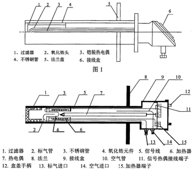 插入烟道的探头顶部是一个过滤器,烟气经过滤后才进入探头的检测器.检测器内是涂有铂电极的氧化锆电解质管与热电偶和一个电炉。